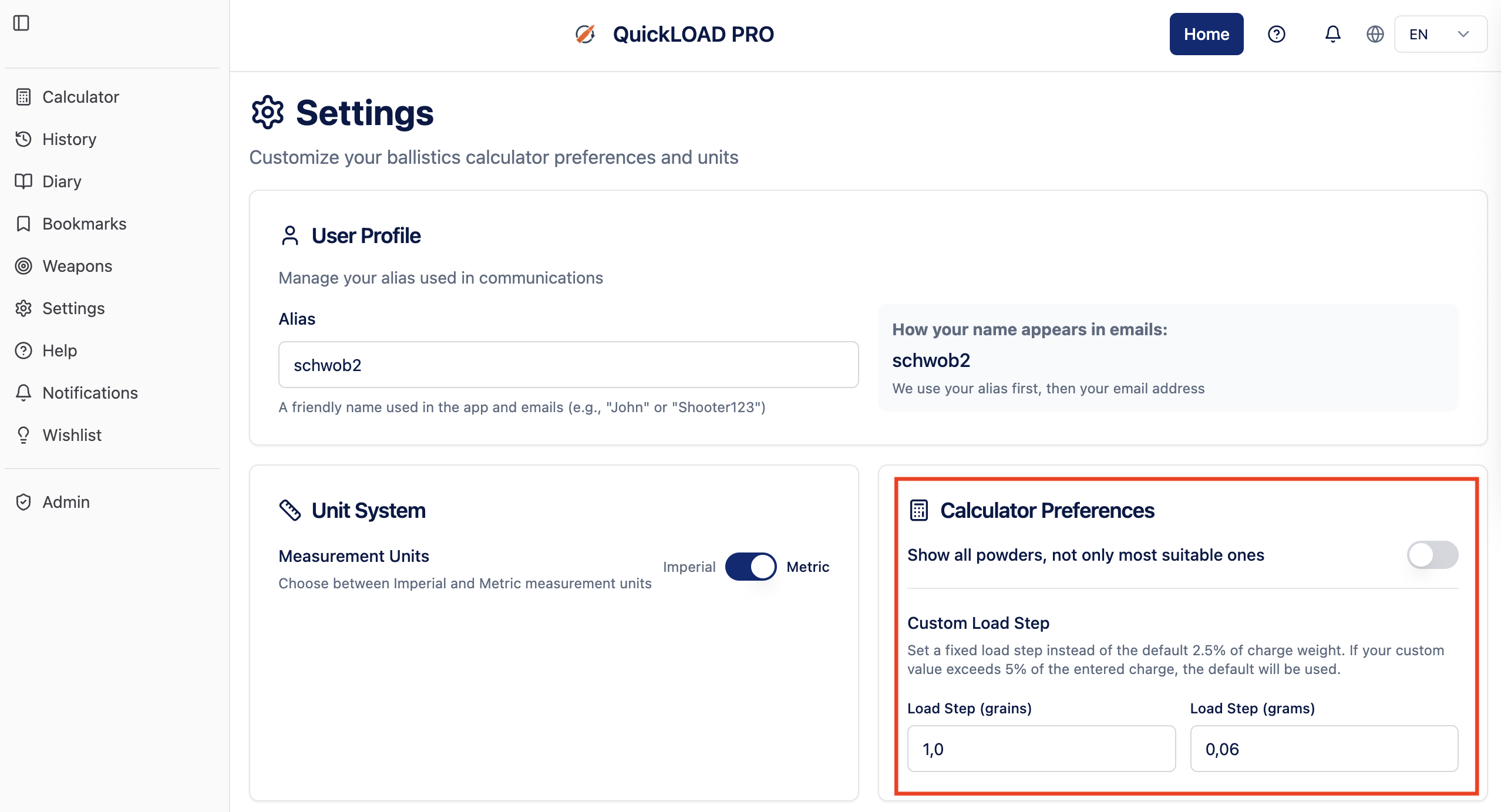 The default can be overwritten in the App Settings under Calculator Preferences. There, you can set the load step in grains or grams.